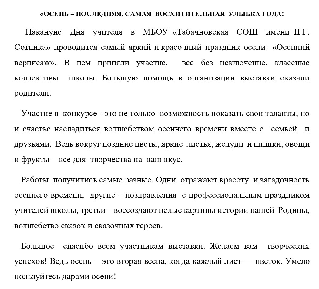 Накануне Дня учителя в МБОУ «Табачновская СОШ имени Н.Г. Сотника» проводится самый яркий и красочный праздник осени - «Осенний вернисаж». В нем приняли участие, все без исключение, классные коллективы школы. Большую помощь в организации выставки оказали родители.