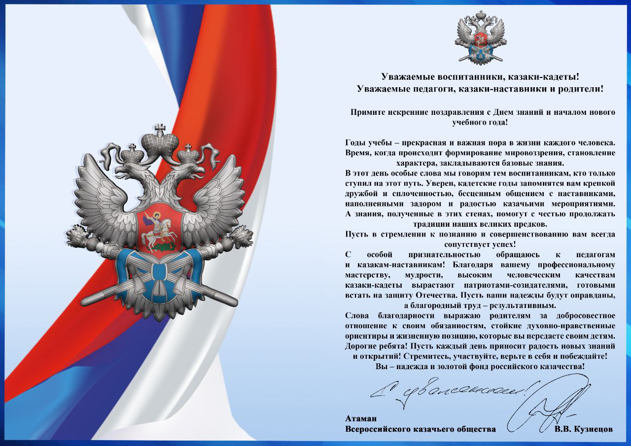 клянусь свято хранить верность России и казачьим традициям, не щадя сил и самой жизни стоять за свободу и интересы казачества; честно и добросовестно выполнять возложенные на меня обязанности в казачьем кадетском классе, образцово учиться, соблюдать дисциплину и казачью честь; не за страх, а по-совести подчиняться своим преподавателям, офицерам-наставникам и власти атамана, жить, соблюдая в семье и обществе заповеди Господни, нормы доброй нравственности и Законы казачьего братства.