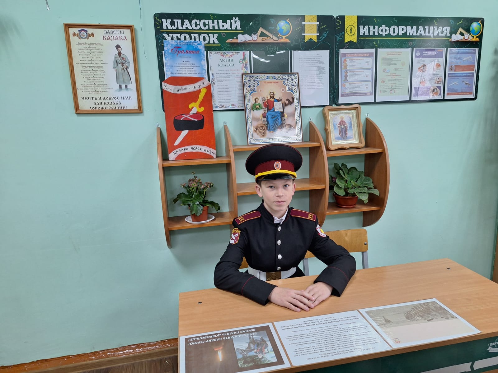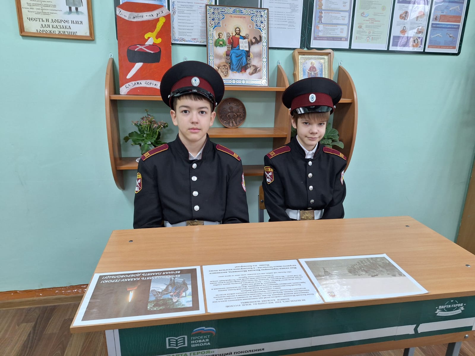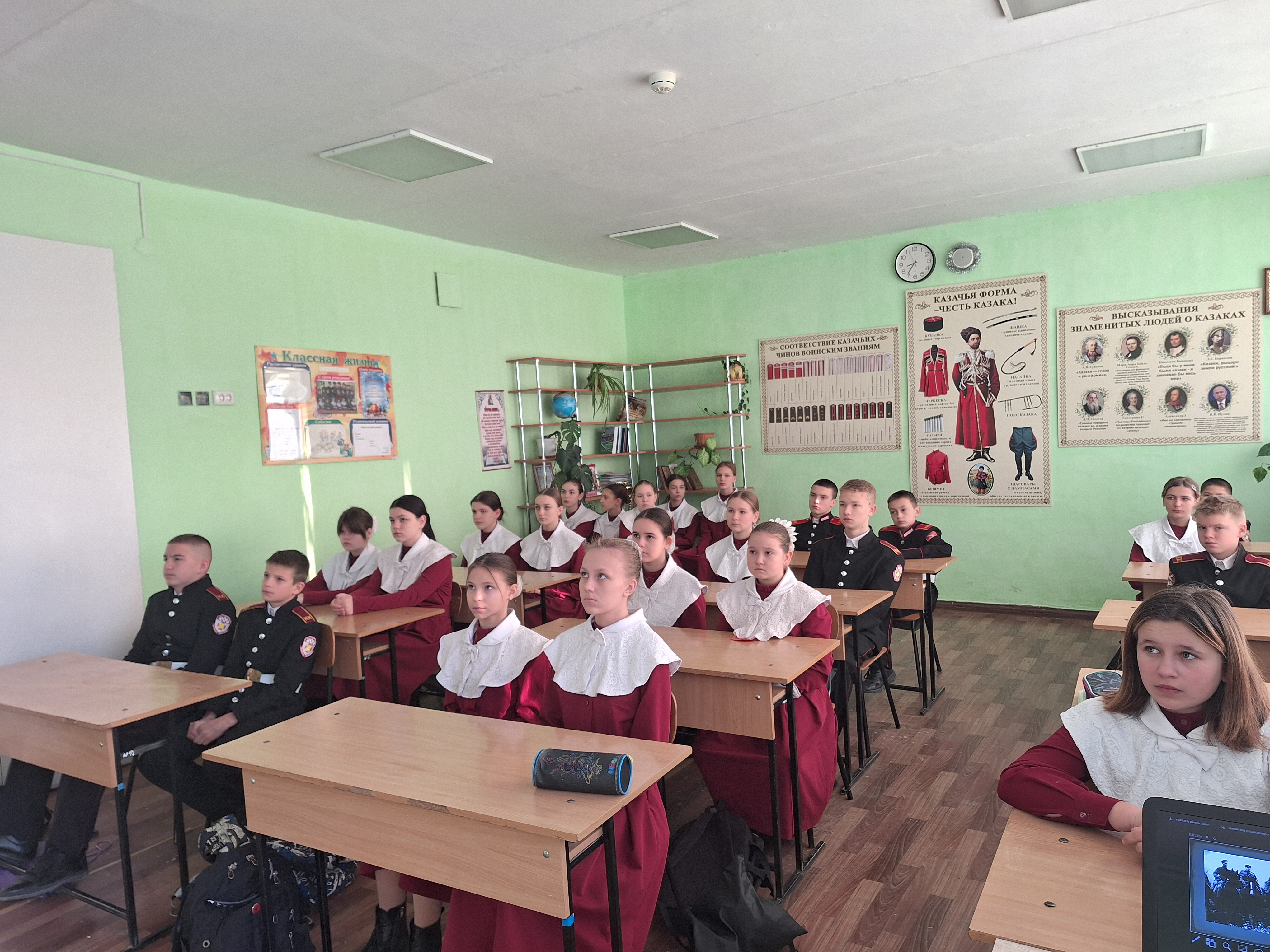 На уроке в 6-К кадетском казачьем классе «Православные святыни: иконы», учитель – Малашенко О.С. рассказала ребятам историю появления иконы «Спас нерукотворный». Кадеты, работая в группах, подготовили рассказ об иконах «Покрова Пресвятой Богородицы» и иконе Божией Матери «Донецкая», у которой особая миссия в нашей стране. Урок закончился видеороликом о паломничестве Донецкой иконы в Курскую область в условиях Специальной военной операции.