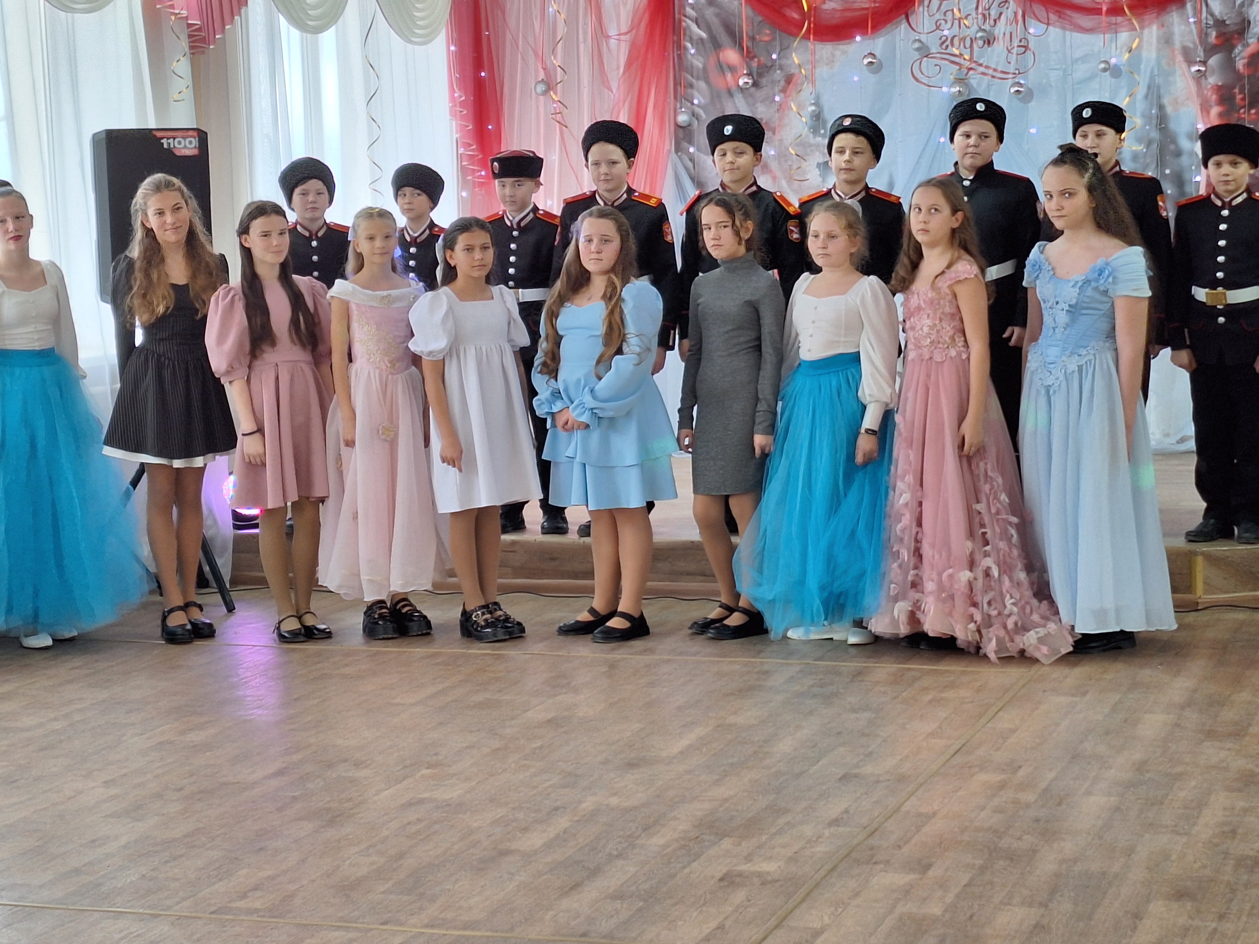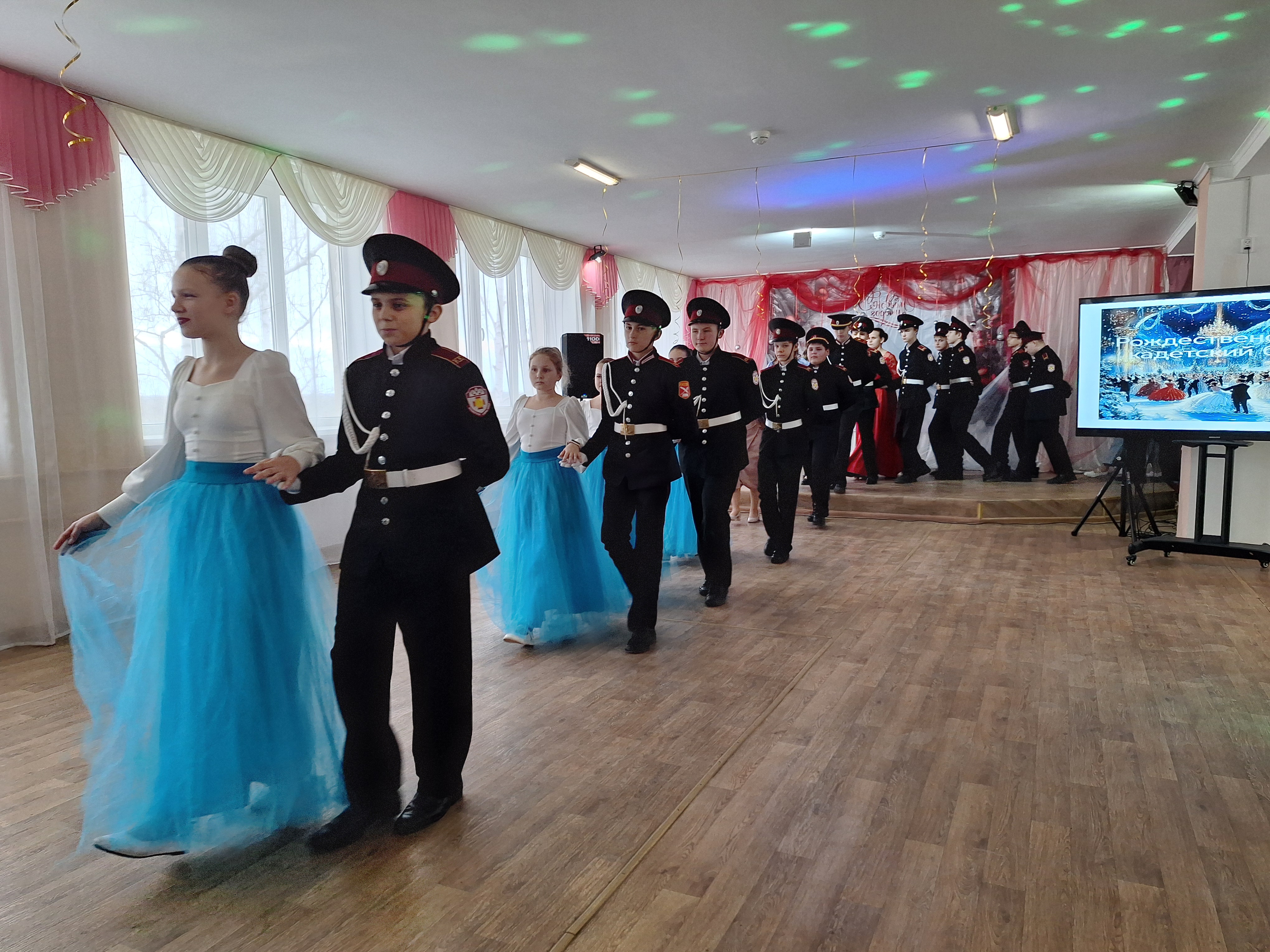Звучит прекрасная музыка, в зал входят нарядно одетые девушки и юноши - кадеты казачьих классов. Представлены почетные гости бала: заместитель атамана ЧКВ по образованию и воспитанию молодежи Воронина Светлана Эдуардовна, настоятель храма Архистратига Михаила протоиерей Иаков Шепельский, участники СВО Харьковы Андрей Александрович и Альбина Борисовна, офицер – наставник – Горобец Игорь Петрович.