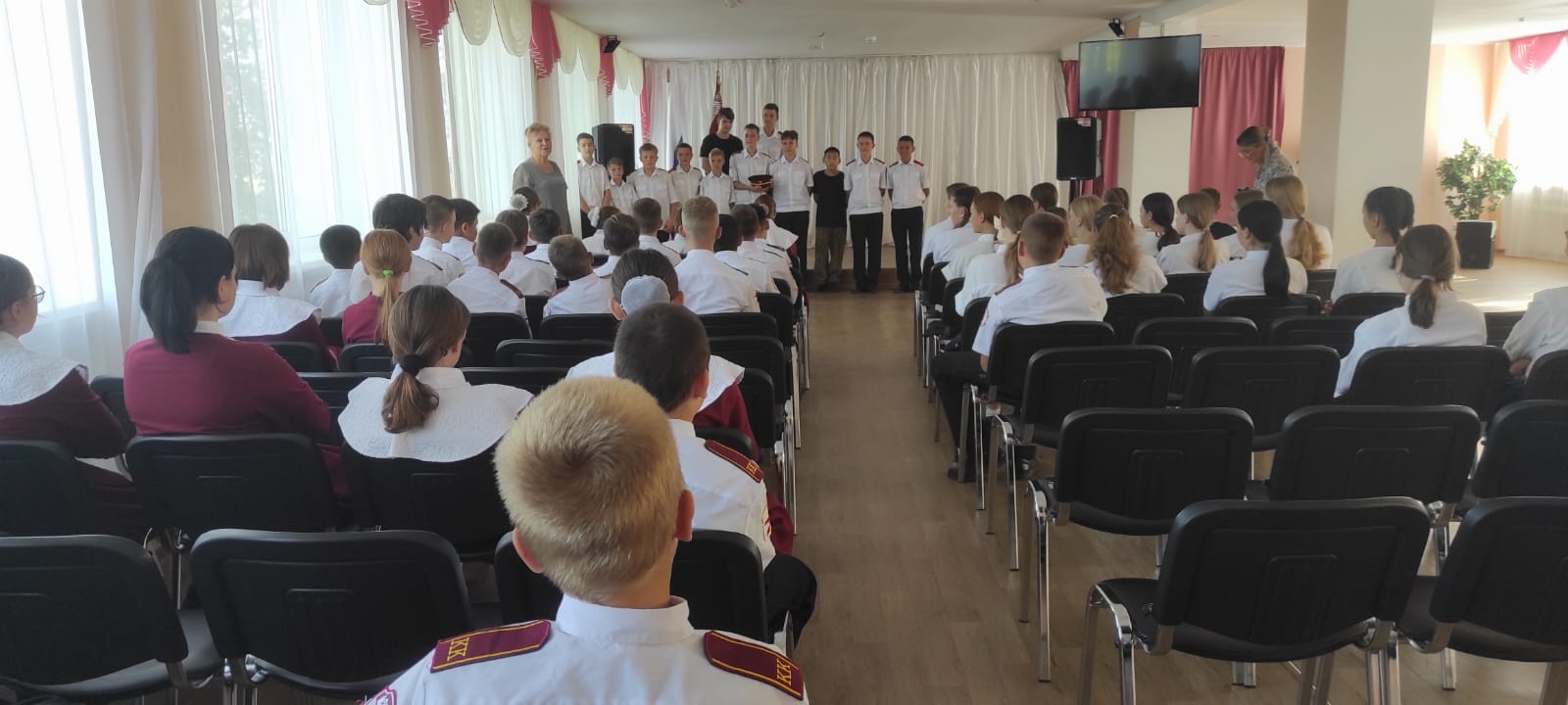 Звучат гимны Российской Федерации и Республики Крым, знаменная группа вносит флаги. Под звуки торжественного марша в зал входят воспитанники казачьего 7-К класса.