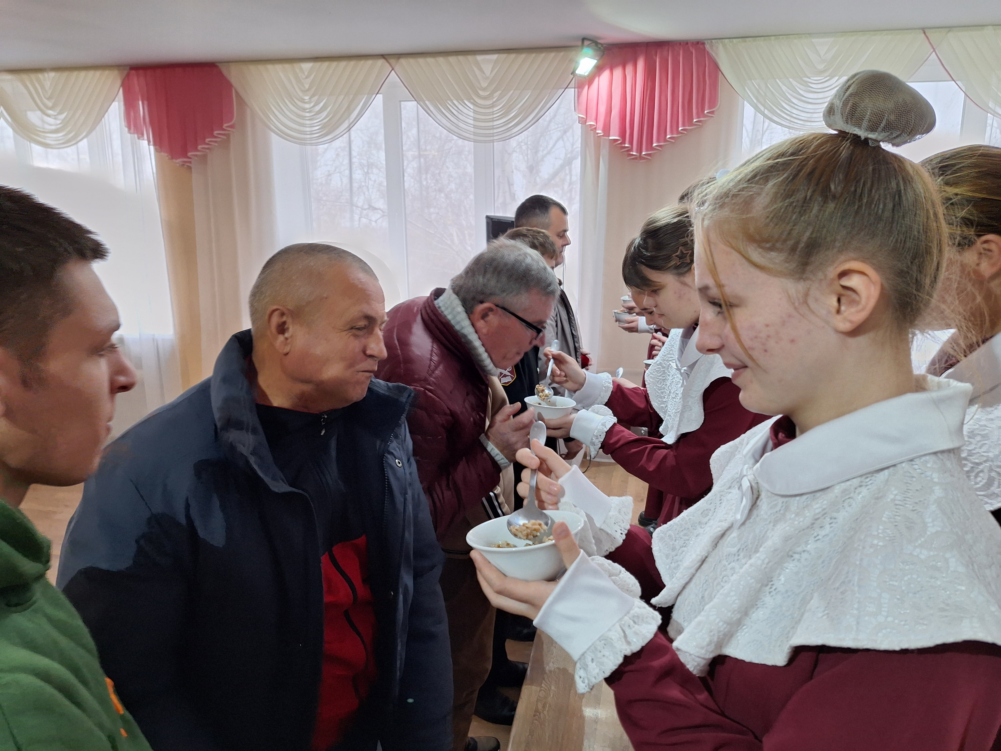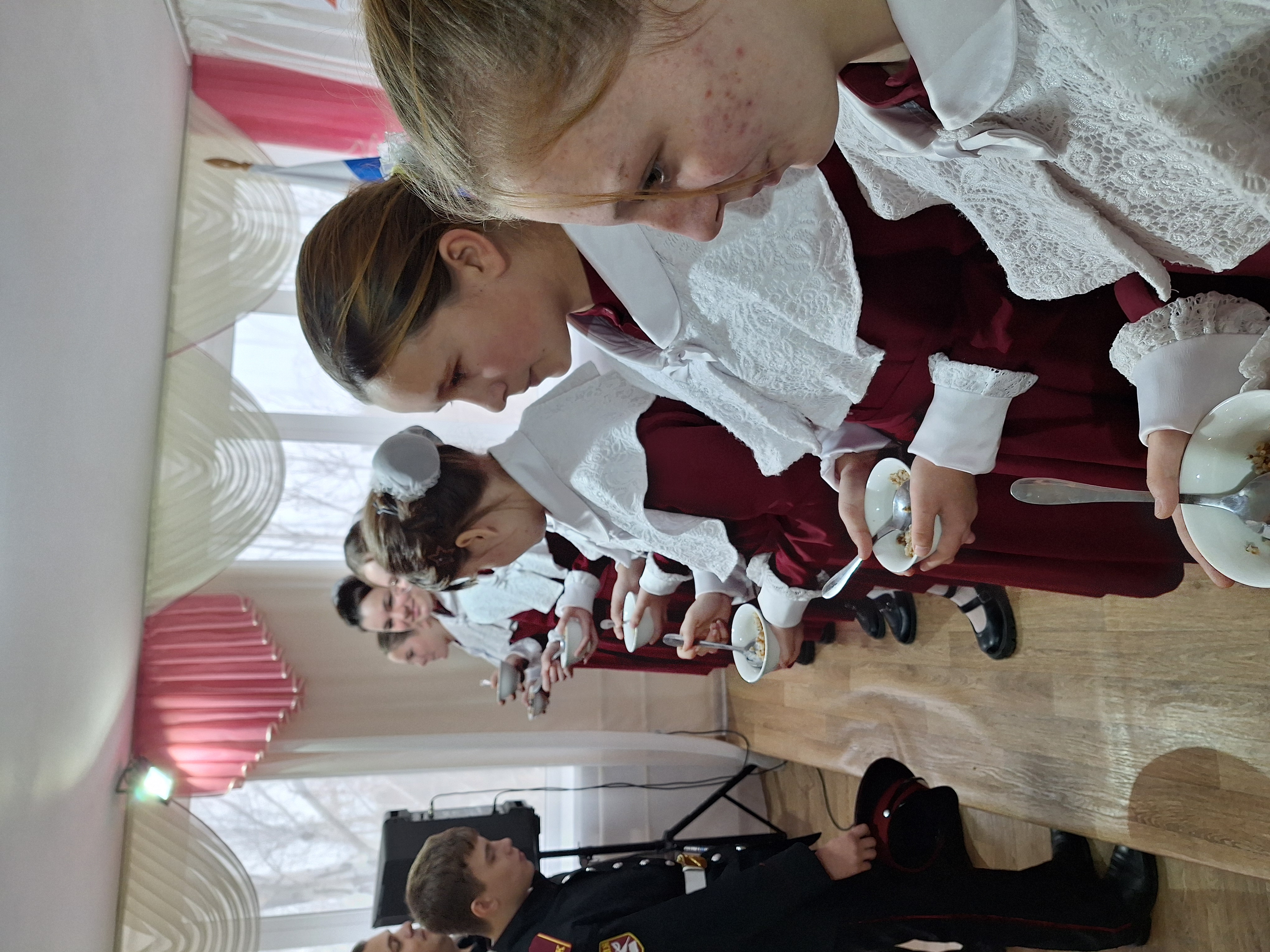 Обряд посвящения в казачки был проведен для девочек 5-К класса. Молодая казачка всегда оберегалась в семье, так как она была хранительницей и продолжательницей казачьего рода. Это выливалось в традициях и обычаях. Одним из таких было вкушение солёной каши. Чтобы девочка жила счастливо, все беды её забирали себе старшие мужчины казачьего рода: ели пригорелую или пересолёную кашу, тем самым оберегая ее от всех жизненных неурядиц.